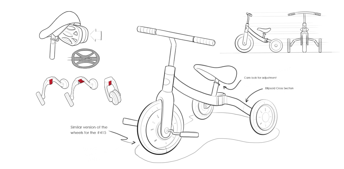 The solution was to develop a trike the supported children in 3 stages of development: learning to pedal, learning ride, and learning to balance. To do this, I worked on several mechanisms to allow the pedals to be removed and wheels to be rotated inward.